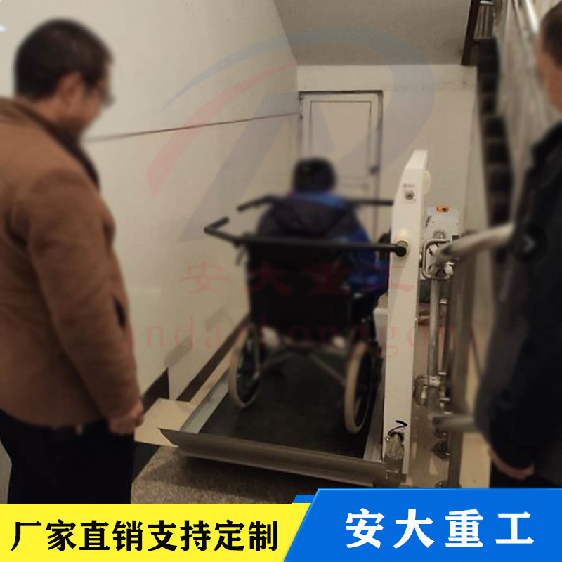 斜挎式無障礙升降平臺(tái)按其運(yùn)行方向分曲線型和直線型兩種。直線型多采用齒輪齒條式驅(qū)動(dòng)機(jī)構(gòu),沿樓梯做上升和下降,只能作直線運(yùn)行不能轉(zhuǎn)彎,傾斜角一般不大于35度,適用于樓層較低